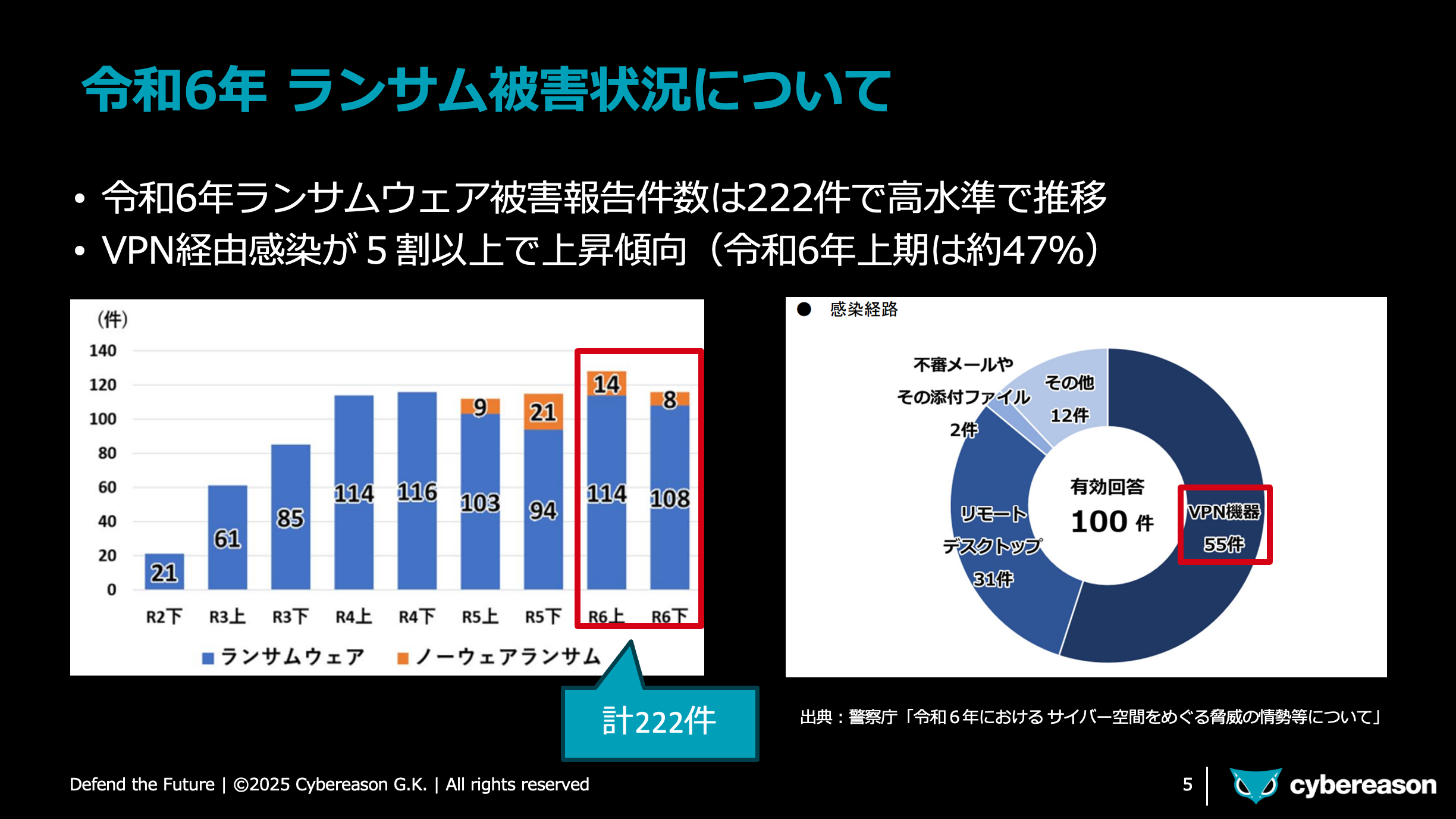 警察庁の最新報告によると、令和6年のランサムウェア被害件数は222件に達し、依然として高水準で推移しています。特に注目すべきはVPN経由の感染が全体の約5割(47%)を占める点で、攻撃経路としてのリスクが急増しています。