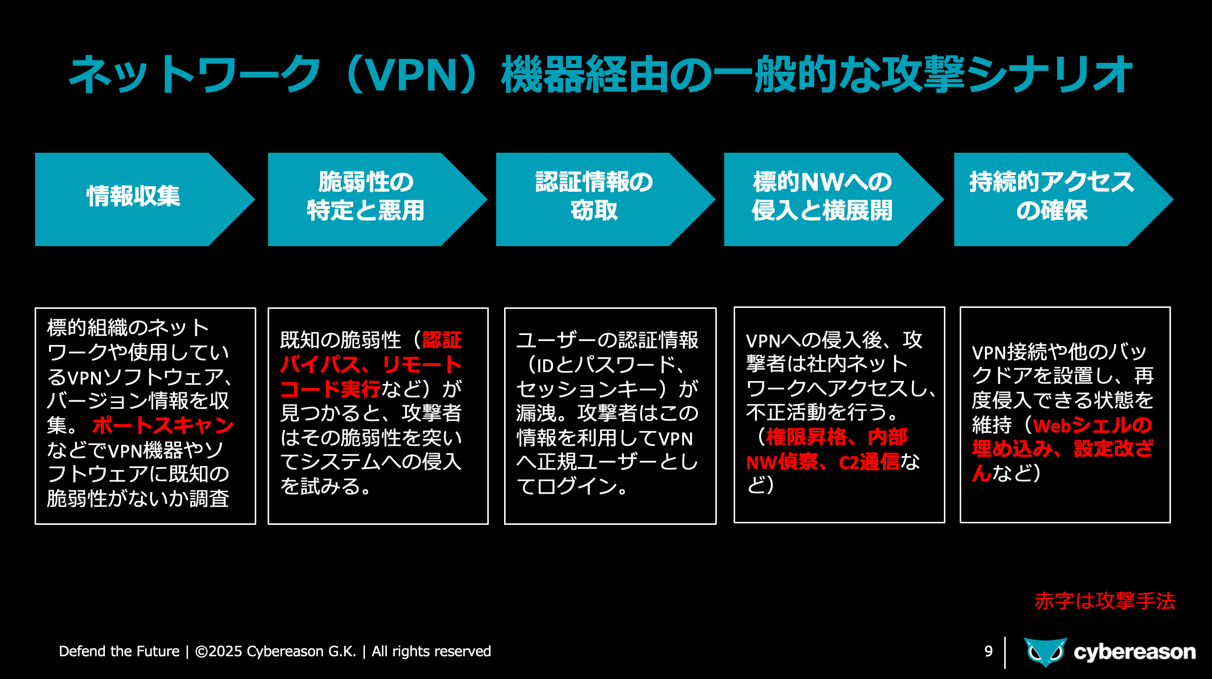 ランサムウェア被害の半数以上がVPN経由であり、脆弱性などを突いた攻撃などにより内部に侵入され、重大なインシデントが発生します。万全の脆弱性対策をしていたとしても、ゼロディや未知の攻撃リスクは依然として残っており、偵察行為の早期検知や不正アクセスやログの監視、インシデント発生時の素早いレスポンス対応が重要となります。Cybereason XDRは主要なVPN機器との連携が可能であり、エンドポイントログとネットワークやVPNログの相関解析により、侵入前・侵入後の検知やレスポンス対策として有効と言えます。