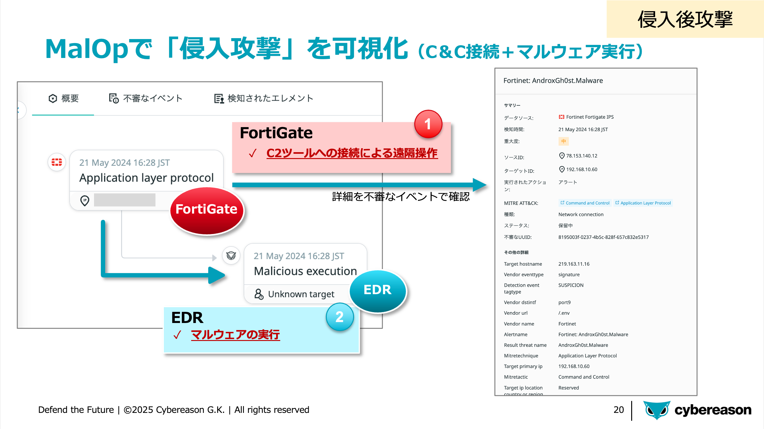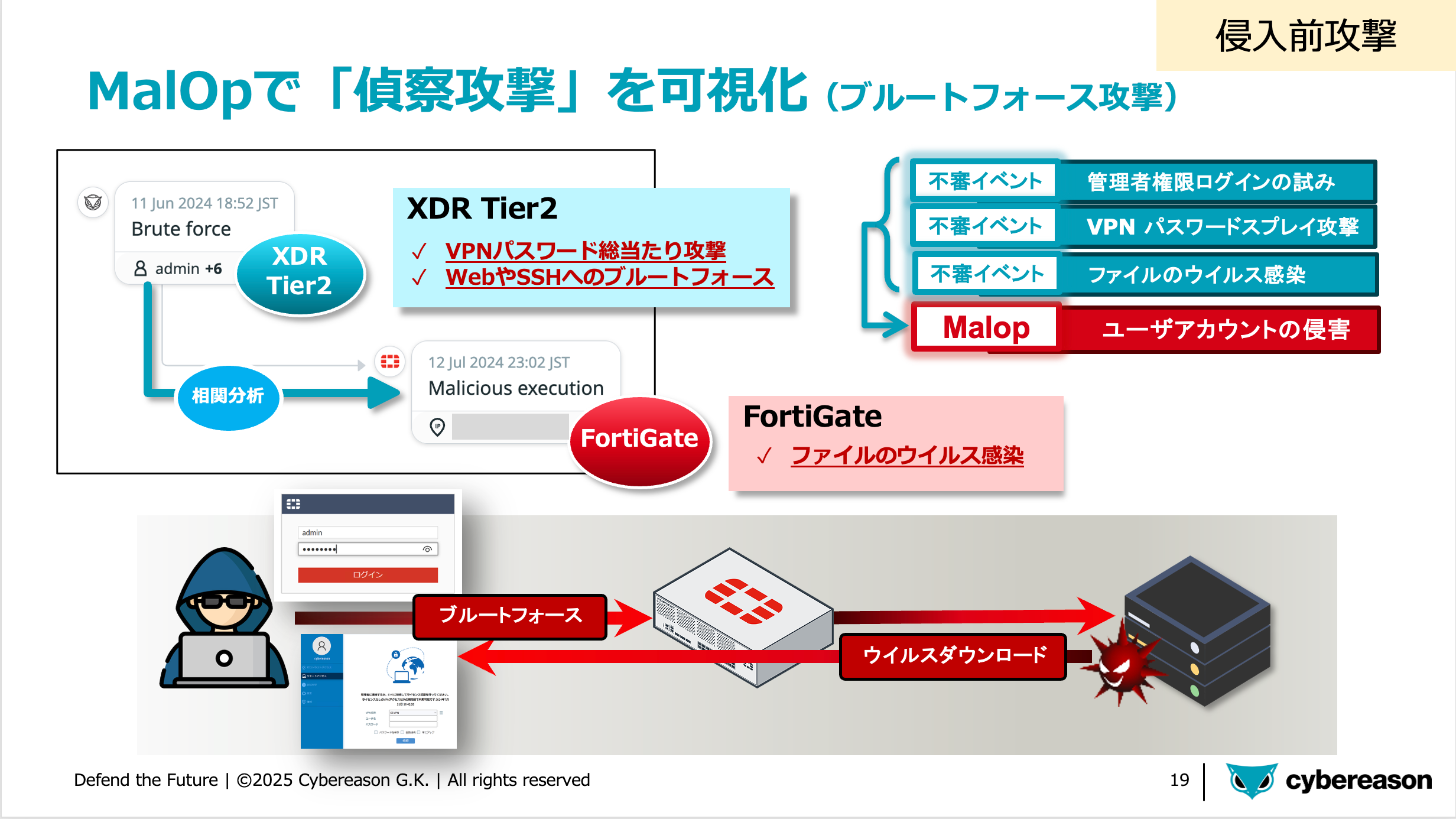FortigateとCybereason XDRを連携させた具体的な実例をご紹介します。VPN機器から出力されるログをXDRに取り込むことで、侵入前後の行動を相関的に把握できます。