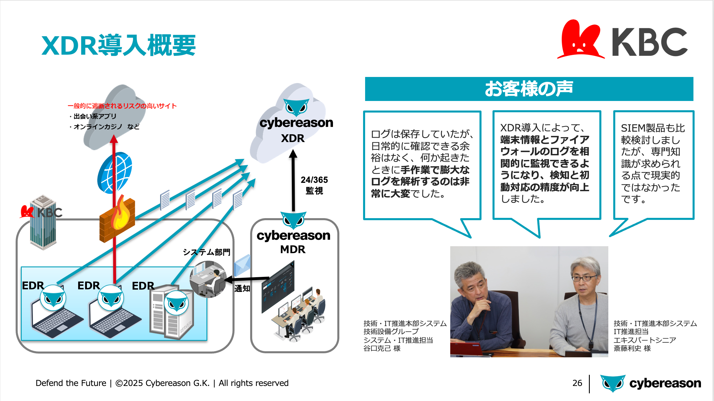 KBCグループホールディングス様では、近年のネットワーク機器を狙う攻撃増加を受け、Cybereason XDRを導入されました。約1,000台の端末を対象に、EDR・NGAV・MDRに加えてXDRを活用しています。