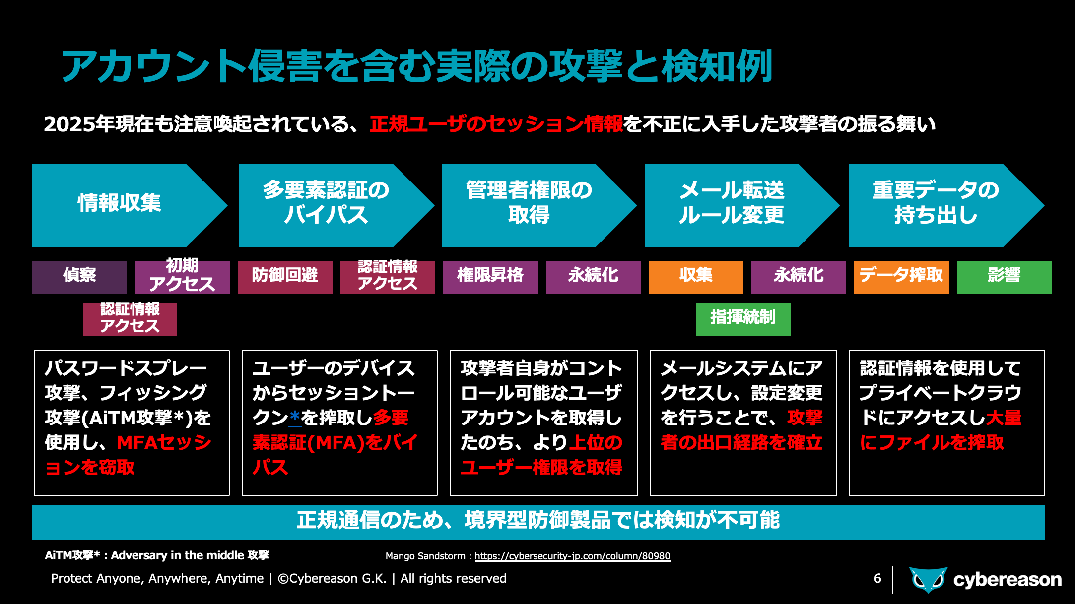 アカウントが侵害され、不正ログインが成功してしまうと、攻撃者は企業のネットワークシステムに侵入します。特に重要なのは、不正ログインが成功した場合、エンドポイントでのマルウェアやランサムウェアの感染なしに、クラウドサービスへ直接アクセスし、機密情報を窃取することが可能になる点です。攻撃者は、認証情報の窃取や権限昇格を行い、アカウントを用いてシステムに侵入することを目的達成の手段としています。また、実際の攻撃手法には、セッションクッキーやトークンを盗み取り、多要素認証(MFA)をバイパスする手法も存在します。エンドポイントを守るEDR(Endpoint Detection and Response)はセキュリティにおいて最重要ですが、アカウント侵害からデータ窃取に至る攻撃経路の中には、エンドポイントを経由しない場合も存在します。