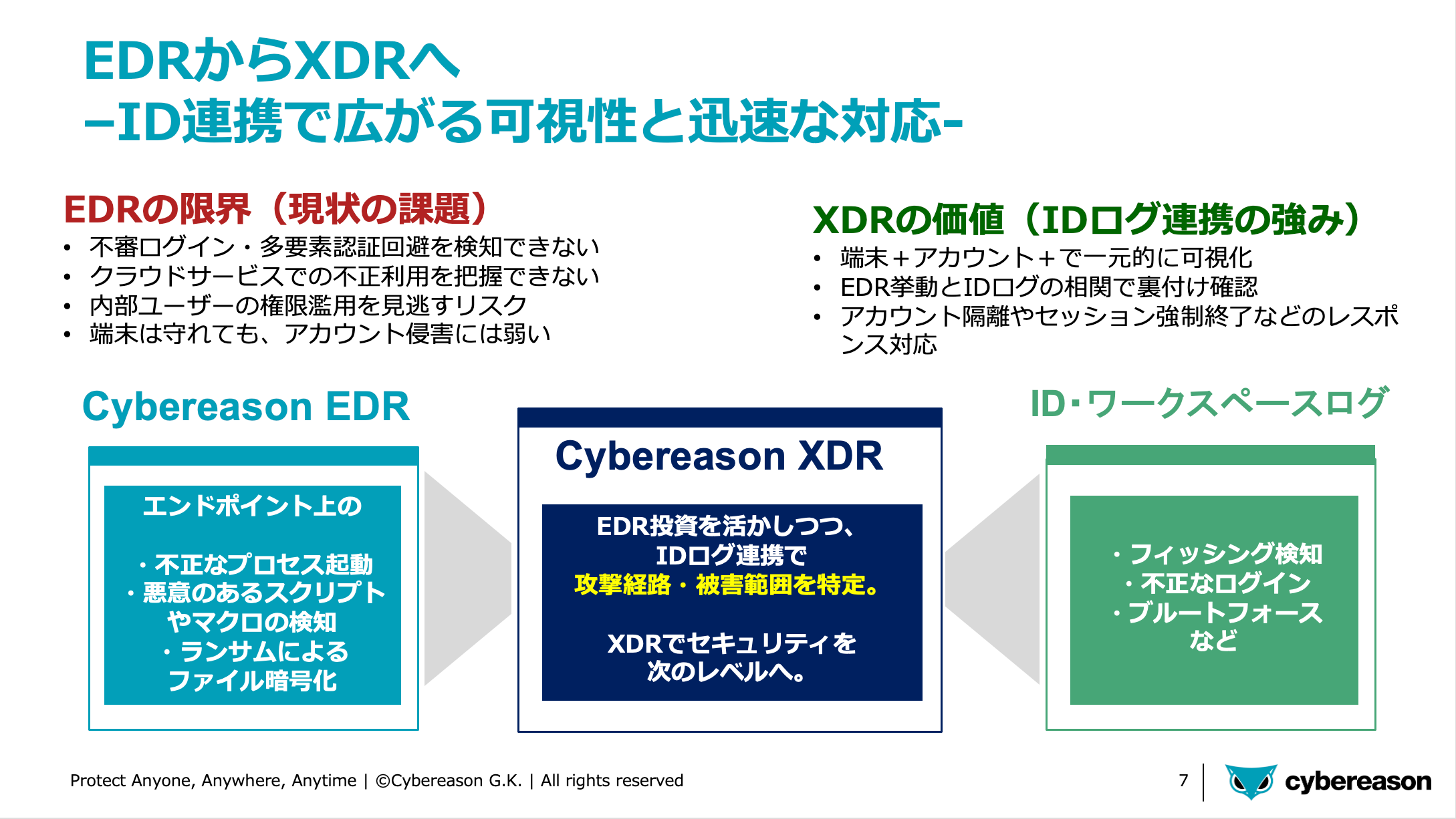 XDR(Extended Detection and Response)は、このEDRの限界を補い、セキュリティレベルを向上させます。IDやワークスペースのログをXDRに取り込み、相関分析を行うことで、アカウント侵害の攻撃の兆候や不正ログインなどを検知することができるようになります。