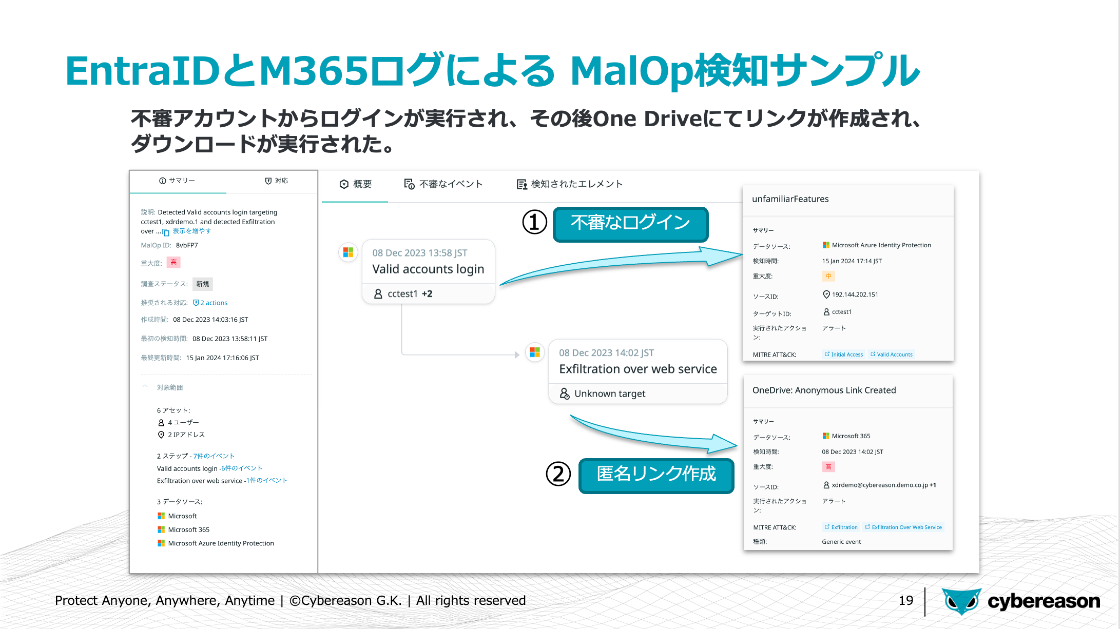 実際に、Entra IDのログにおける不正なログインの検知と、それに続くデータ操作のログを相関分析し、攻撃として通知した事例があります。また、Entra IDの不審なログインと、M365(OneDrive/SharePointなど)のログから検出された正規のウェブサービスを利用したデータ持ち出しのログを相関的に分析し、攻撃として認知したケースもあります。これは、EDRのログが一切関与しなくても、IDとワークスペースのログだけで相関分析ができるというXDRの大きな特徴を示しています。これにより、境界防御では見逃されがちな正規通信を悪用した攻撃を早期に検知し、インシデント対応までの時間を大幅に短縮します。