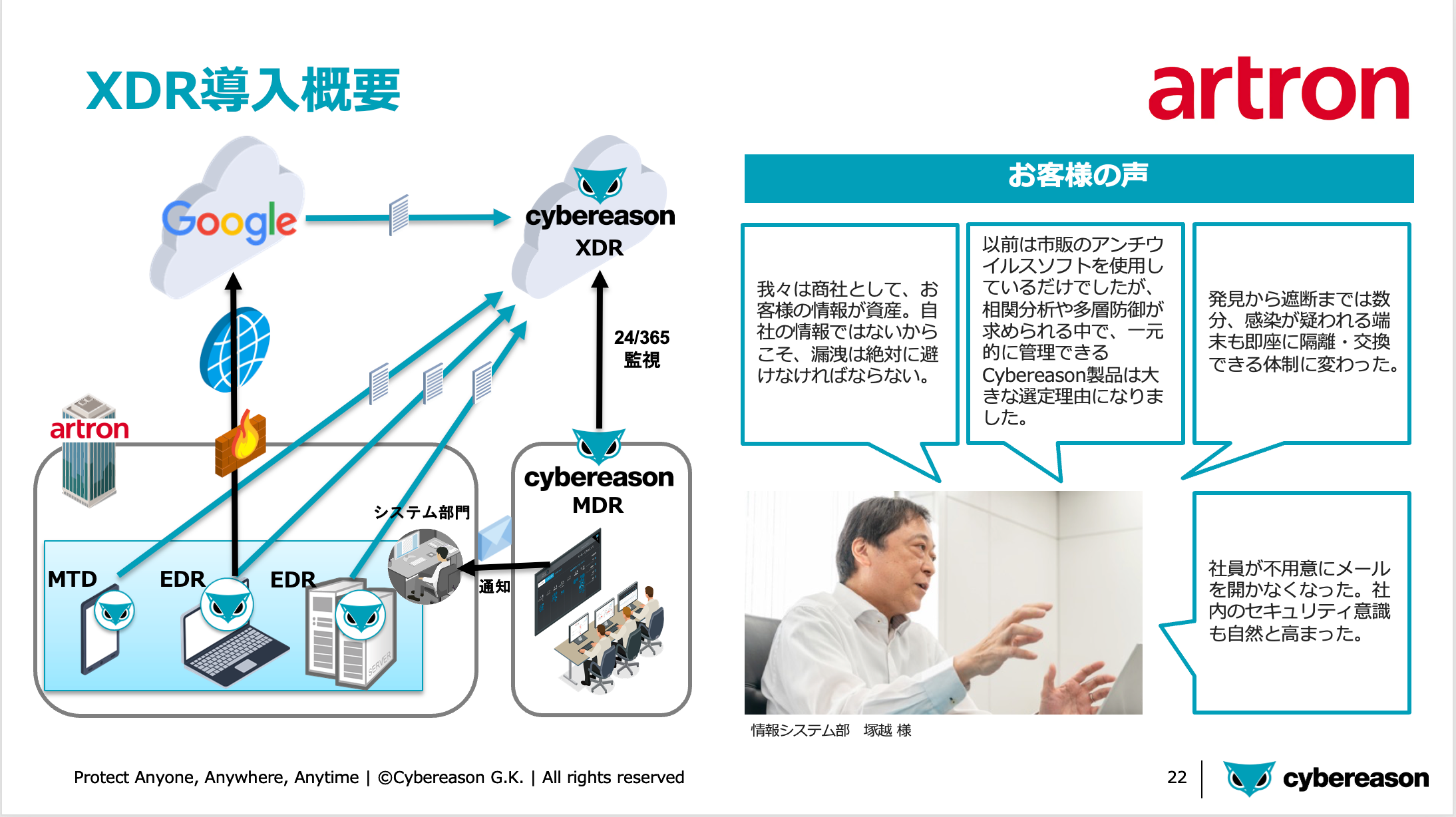 エレクトロニクス分野の技術商社である東亜電気工業様では、既存のEDRに加え、セキュリティ強化の必要性からXDRを導入いただきました。