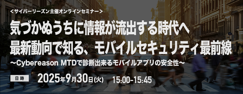 <9/30 オンライン>気づかぬうちに情報が流出する時代へ 最新動向で知る、モバイルセキュリティ最前線 〜Cybereason MTDで診断出来るモバイルアプリの安全性〜