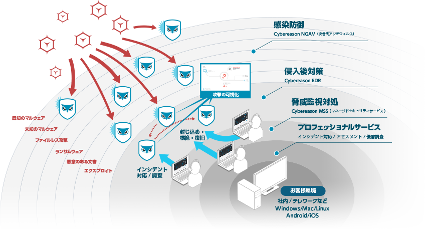 Cybereason NGAVに加えて、侵入後対策のCybereason EDR、脅威監視対応サービスのManaged Security Serviceをワンストップで提供することにより、真のエンドポイント保護プラットフォームとして脅威から企業の情報資産を保護します。