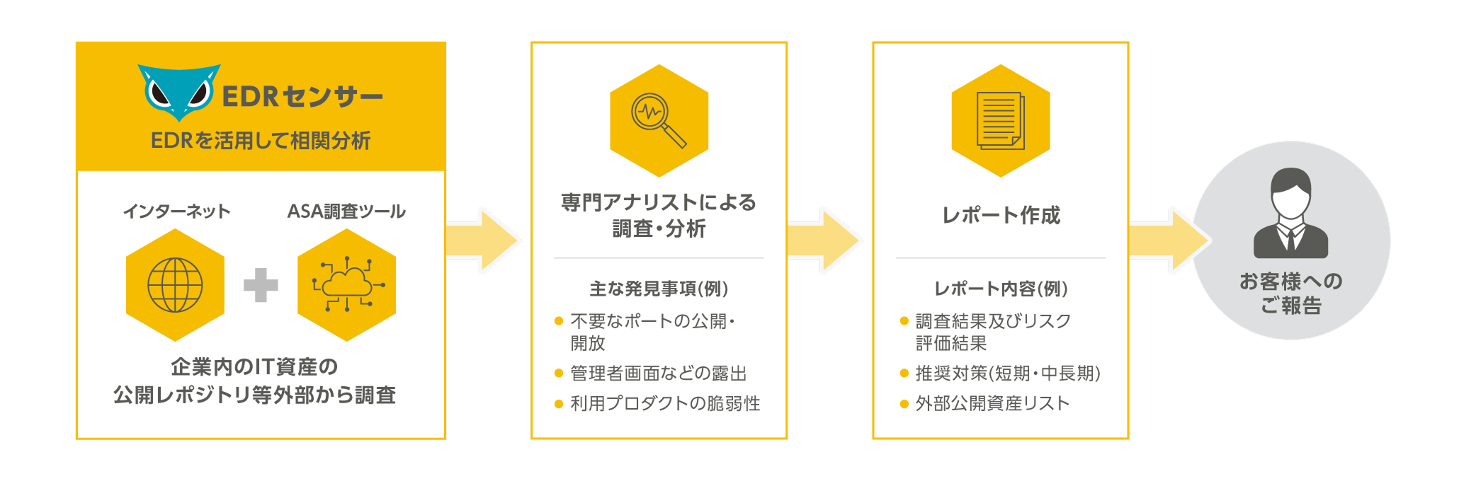 「Cybereason ASA(攻撃面可視化)サービス」は、Cybereason EDRと連携することで、企業の外部攻撃面に対する可視化を実現します。また本サービスにより、クラウド環境や関連ドメインにまたがる外部公開資産、設定ミス、露出情報を攻撃者視点で収集・分析し、これらをEDRのデータと連携することで、より多岐に渡る攻撃の入り口を明らかにします。また、特定されたリスクはASAの視点で整理され、調査結果に基づいた実効性の高い対策アクションとして提示します。これにより、可視化にとどまらず、具体的な改善ステップへと直結できる点が本サービスの大きな特長です。